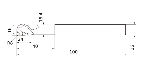 (Ball nose end mill, 2 flute, Medium cut length, Relieved neck)