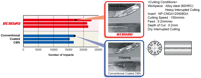 With the expansion of BC8020, Mitsubishi can offer 3 coated CBN grades for machining of hardened steels. These 3 coated CBN grades cover a wide range of applications.