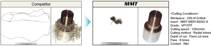 IDEAL CHIP CONTROL EVEN IN THE LATTER HALF OF PASSES WHEN CONTINUOUS CHIPS ARE USUALLY PRODUCED. (M-CLASS INSERTS WITH 3-D CHIP BREAKERS)