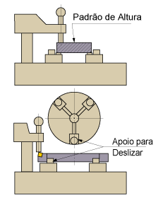 - Ponha o padrão de altura, o qual deve ter a mesma altura da ferramenta, alinhando sobre os apoios para deslizar, então ajuste o indicador.