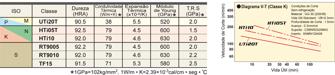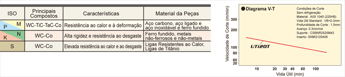 Série P para usinagem de Aço, série K para usinagem de ferro fundido e série M para usinagem geral.