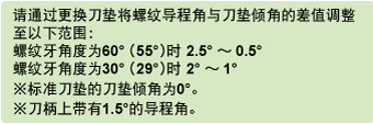 (导程角2.2°)–(2°– 1°)=0.2°– 1.2°的刀垫倾角适合。 请按照刀垫规格表(A390、A391)更换为倾角1°的刀垫。