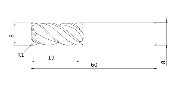 (Corner radius end mill, Medium cut length, 4 flute, Irregular helix flutes)