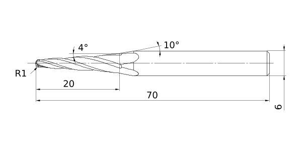 (Ball nose taper end mill, Long cut length, 4 flute, For aluminum impellers)