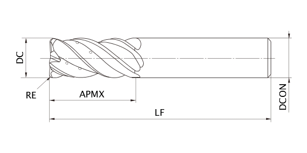 (Corner radius end mill, Medium cut length, 4 flute, Irregular helix flutes, with multiple internal through coolant holes)