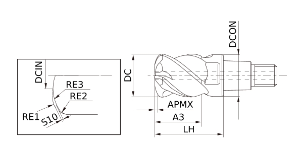 (Duplex corner radius head, 4 flute, For high feed, with coolant hole)
